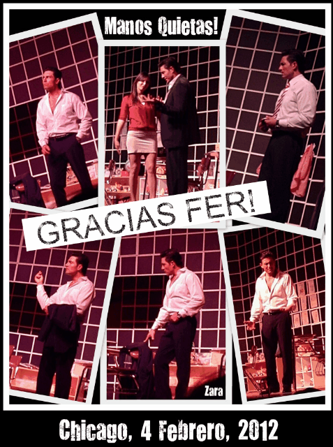 El ver a Fer en teatro fue para mi un sueno que veia muy lejano, y poder disfrutarlo tantas veces en varias ciudades fue una experiencia inolvidable, como todo lo relacionado con Fer. Manolo lleno todas las expectativas que me hice sobre ver a Fernando en un escenario de teatro , Manos Quietas me enloquecio, me cautivo y fue hermoso ver cada una de sus funciones pues todas fueron distintas, cada una poseia un encanto unico, ese toque especial que solamente le puede dar un actor de la talla, profesionalismo, preparacion, carisma y talento como el que tiene mi adorado Fer. Tener que decir adios a una obra que me dio tanto placer me duele, pero celebro todo el apoyo y el carino que se brindo a Manos Quietas de parte del publico, siempre todas las plazas llenas, el entusiasmo de la audiencia se sentia. Todo el elenco fue lindo y tuvo detalles bellos con las colungueras y ademas la quimica entre ellos fue buenisima!!! Fer la palabra GRACIAS me parece pequena pero te lo digo de todo corazon, MQ y Manolo se quedan en mi corazon y en mi album de recuerdos que son mi tesoro... Te admiro, te apoyo y como siempre quedo esperando tu regreso con otra joya de interpretacion.