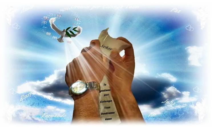 SI ALGUNA DE UDS DESEA DEJAR LOS NOMBRES DE LAS PERSONAS QUE NECESITEN DE NUESTRAS ORACIONES AQUI LO PUEDEN DEJAR O SI ES PRIVADO ME PUEDEN ESCRIBIR A MI EMAIL Y SOLO PONDREMOS PRIMER NOMBRE SIN MENTIONARLAS......AL IGUAL QUE ALGUNA LE GUSTARIA QUE PUSIERA UNA CANCION EN ESPECIAL ME LO COMUNIQUEN