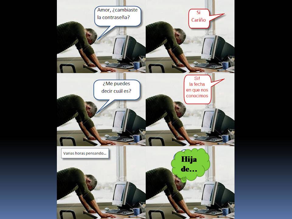 JAJAJAJ MUY BUENO TREMEN,. SI ES QUE LAS MUJERES TENEMOS UNA MALA LE....,..JAJAJAJ,.. LO MALO QUE ALGUNAS VECES HASTA A MI SE ME OLVIDAN LAS CONTRASEÑAS,...JAJAJAJAJAJAJAJ LO QUE ES LLEVAS ACIERTA EDAD,..JAJAJAJAJAJ