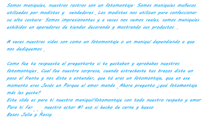 Julia y Rossy, son increibles tanta creatividad un trabajo que dice mucho no tengo palabras solo esto es un honor ser una chica del slide beso Yamilex