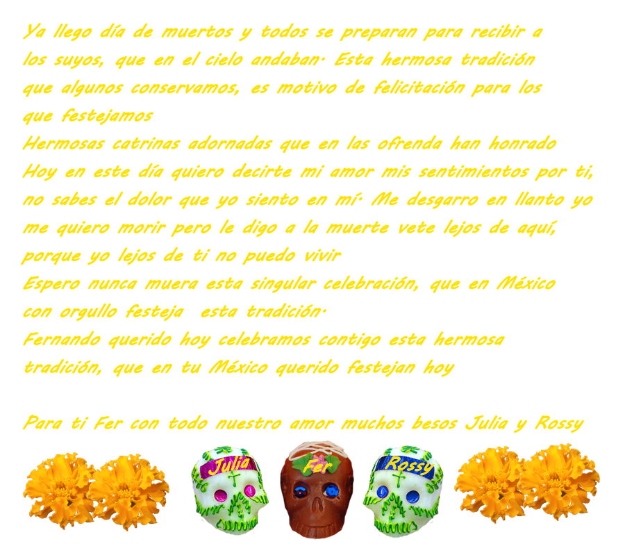 Julia y Rossy cada día me sorpenden, esto si que no me lo esperaba de ustedes. Gracias por acordarse de mis tradiciones me siento orgullosa de ser mexicana.